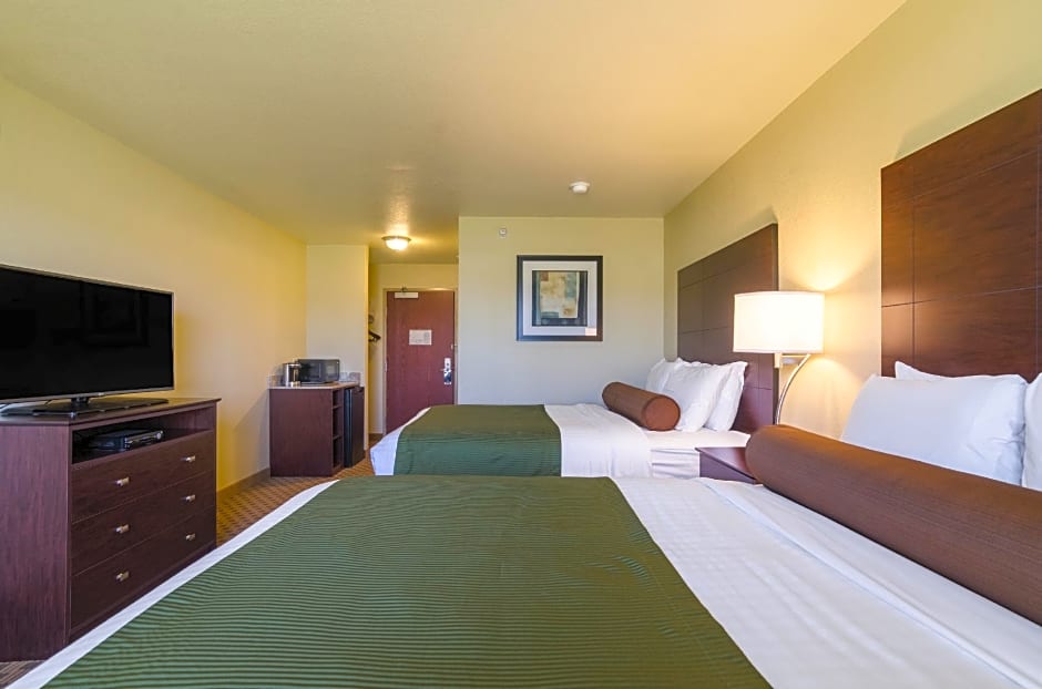 This room features lowered bedding and extra space for wheelchair accessibility. A microwave, small refrigerator and in-room coffee maker are provided. A flat-screen TV and an accessible bathroom are provided as well. Audible and visual alarms for hearing impairment are included.